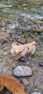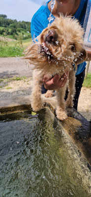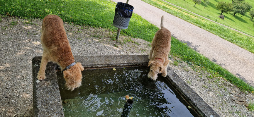 Jede Wassergelegenheit wird ausprobiert... zuerst zum trinken... und nachher ist es ein guter Plauschplatz... es wird auch alles erkundet... beschnüffelt... wer war wohl vorher hier...