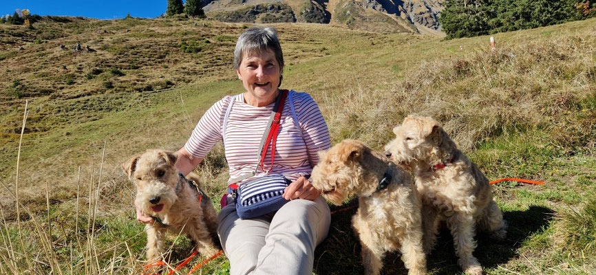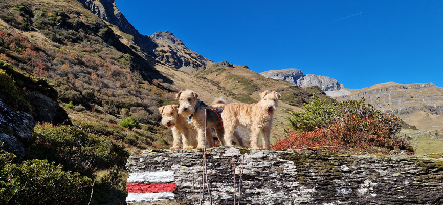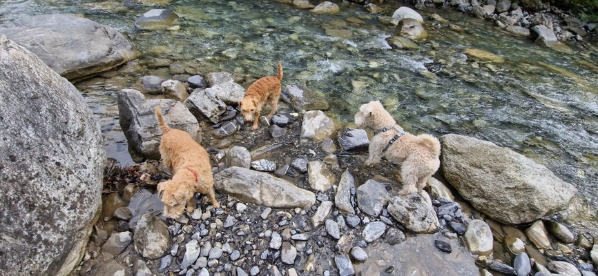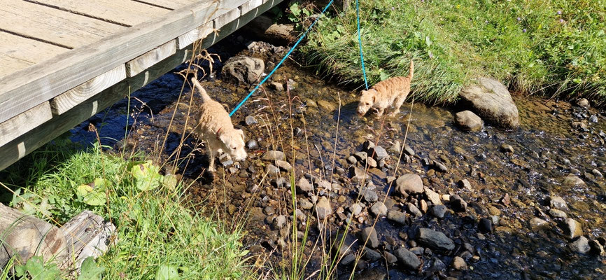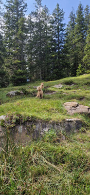 Heja hat das Freude gemacht... mit den beiden LakyLadys Bonnia und Geelia in den Bergen unterwegs zu sein... uns an Wegweisern orientieren... keine Ahnung was uns als nächstes erwartet... und immer schön zusammen Neues entdecken... wo es Wasser hatte gabs ein Bad... oder einfach den Durst löschen und die Pfoten kühlen... wenn dann Frauchen auch noch die Füsse ins kalte Wasser hält... heisst das wir bleiben länger am Ort... da kann man sich dann gemütlich im Gras hinlegen...
