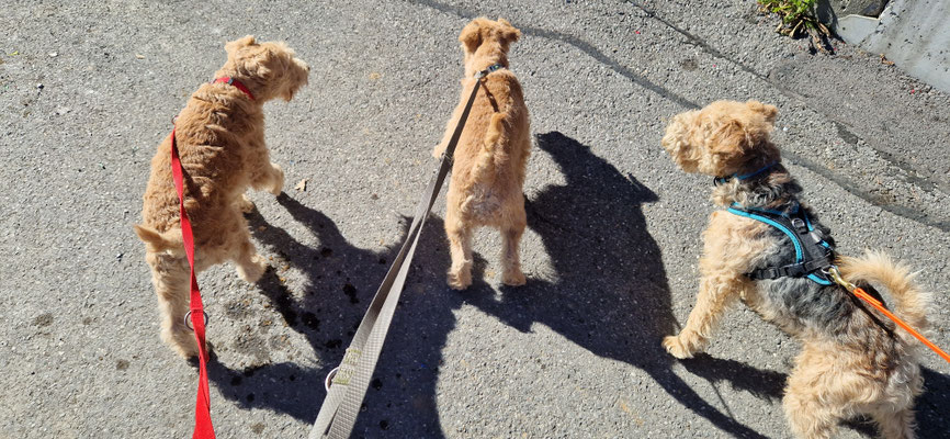 Bonnia geht es schon merklich besser... und einen zusätzlichen grossen Lauf nur mit Geelia alleine ist auch sehr spannend... denn plötzlich muss sie alleine die Kommandi "verstehen" und kann nicht auf Bonnia schauen was gemeint ist... Hundebegegnungen alleine abwägen... "Hallo" sagen oder vorbeilaufen...