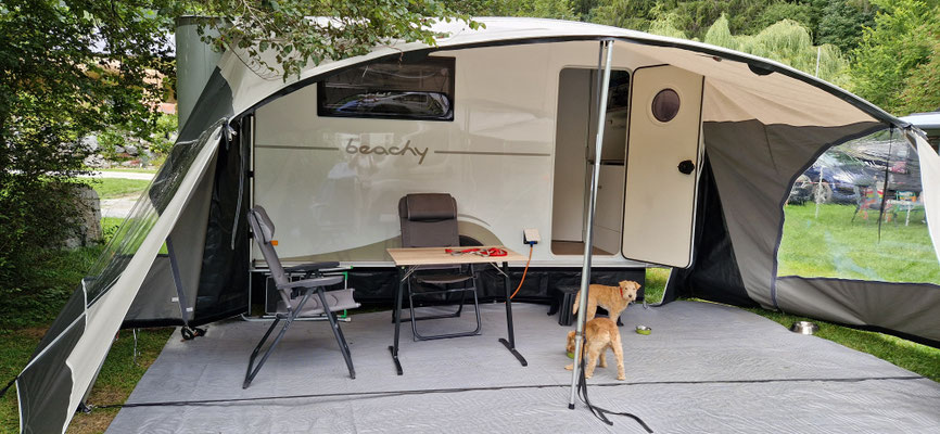 Auf einem Campingplatz dürfen die Hunde nicht frei herumlaufen... also heisst es angeleint bleiben oder in den Wohnwagen "versorgen"...