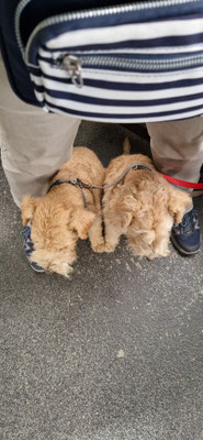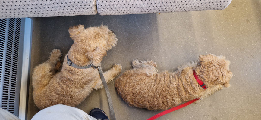 Die Anreise mit Auto/Gondel/Bahn... kein Problem für Bonnia und Geelia... in der Gondel war ihr Platz im "mezzo".... und in der Bahn im "platz" zwischen den Bänken... so stören sie die anderen Fahrgäste nicht und haben ihre Ruhe...