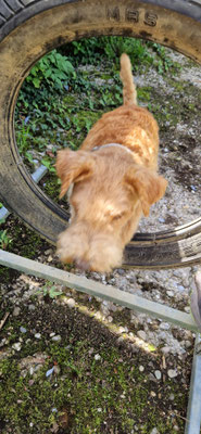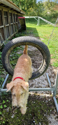 Nachher gab es natürlich noch einen Lauf mit Spiel und Spass für die Beiden zur Belohnung... und weil es da gleich einen Kynolog. Platz mit Hundegeräten hatte... konnte Bonnia ihr Können beim Reif gleich noch zeigen... und Geelia hatte die Gelegenheit es zu lernen...
